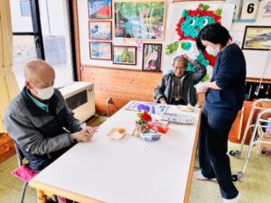 具はこだま園自家製の梅・キムタク・青菜の3種類で、あっという間に皆さん食べられていました!おにぎりなので、普段少しお手伝いして食事をしている利用者さんも、自分でおにぎりを持って食べる事ができていました!そんな皆さんの姿を拝見できとても嬉しい時間となりました。