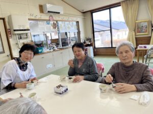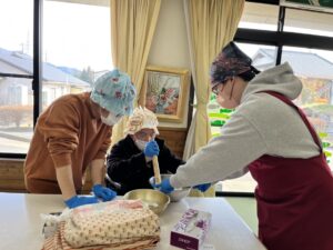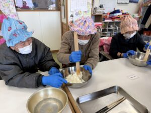 今週一週間、午後の時間にぼたもちづくりを行いました。月~水曜日まで人権擁護さん、金曜日に社協の有賀会長と学び舎の皆様が来てくれました!慣れた手つきで手際よく作られていました。どの曜日も、「このくらいかな?」「お米は半殺しだよ」「きなこは、もう少しつけたほうが美味しいよね」と、皆さんで賑やかに会話をしながら、美味しいぼたもちを作ることが出来ました!またボランティアさんと一緒に活動する機会を設けられるといいなと思います。
